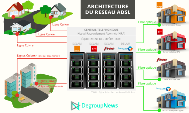 Le lancement de l'ADSL en France a eu lieu en 1999. Depuis des opérateurs alternatifs (Free, Bouygues Telecom, SFR, OVH, etc.) à l'opérateur historique ont dégroupé les NRA afin de proposer leurs propres offres ADSL. Que veut dire dégrouper ?