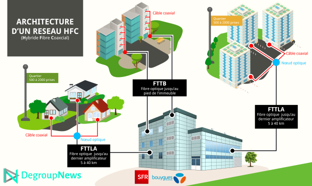 Une partie du réseau est en fibre optique jusqu'à un amplificateur qui distribue ensuite les maisons du quartier via un câble coaxial, ce qu'on appelle le FTTLA (Fiber To The Last Amplifer).