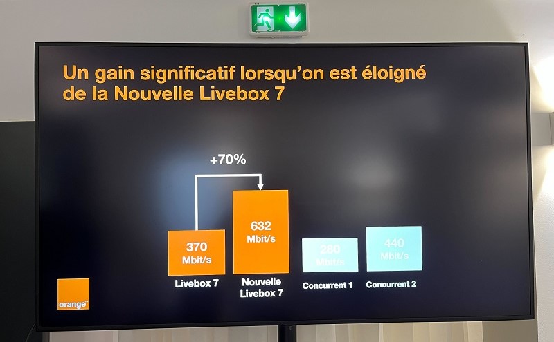 Avec la suppression de la bande 6 GHz, Orange promet un gain significatif lorsqu'on est éloigné de la nouvelle Livebox 7, avec un débit supérieur de 70% par rapport à l'ancienne génération de Livebox 7 compatible Wi-Fi 6E. Orange ose même soutenir la comparaison avec ses deux concurrents qui ont déjà des box internet compatibles avec le Wi-Fi 7 tri-bande, Free et Bouygues Telecom.