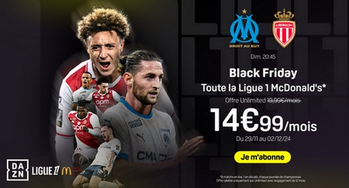 C'est simple : la Ligue 1 n'a jamais été aussi abordable. DAZN propose, en effet, une remise de 25% jusqu'au lundi 2 décembre, faisant ainsi passer son pack Unlimited de 19,99€ à 14,99€/mois pour un abonnement d'an.