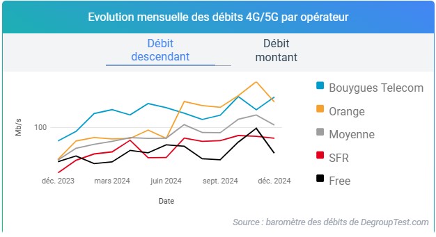 Mais c'était sans compter sur Orange qui, le mois suivant, avait explosé les records avec un débit mobile de près de 130 Mb/s en téléchargement, contre 110 Mb/s pour Bouygues Telecom en novembre 2024.