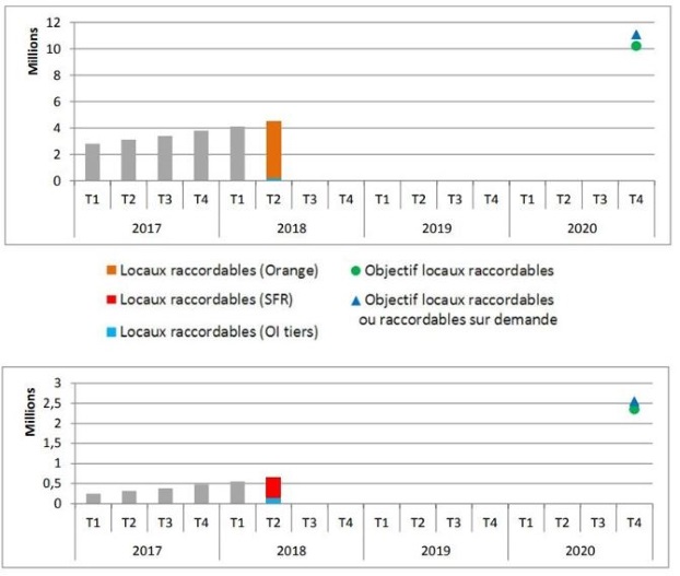 A fin juin, précise l’autorité, Orange avait accompli 40% de son objectif, tandis que SFR avait parcouru 26% du chemin. Un décompte qui permet de prendre la mesure de l’accélération nécessaire. Pour arriver à raccorder 92% de sa zone (11,1 millions de locaux) à fin 2020, l’opérateur historique devra tenir une cadence moyenne de 576 000 locaux raccordés lors des 10 prochains trimestres, à comparer avec 409 000 au T2 2018. Orange retrouve son rythme du T4 2017 après un trou d’air hivernal. Encore loin de la trajectoire idéale, mais bien plus proche que SFR.