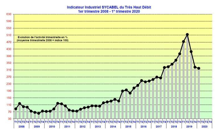 Cette initiative fait écho au signal d'alarme tiré depuis un an par le syndicat des industriels français du secteur, qui compte parmi ses rangs plusieurs poids lourds nationaux (Acome, Nexans) ou européens comme Prysmian. Le Sycabel souligne ainsi trimestre après trimestre la forte baisse des commandes de fibre optique à destination du secteur français des télécoms (ci-dessous) et la hausse concomitante des importations asiatiques.