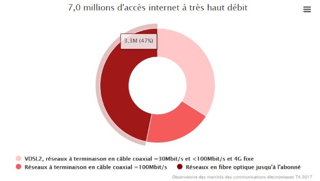 5,4 millions d’abonnés profitaient de l’Internet à très haut débit en France à fin 2016. Un an plus tard, ils étaient 7 millions, selon les décomptes réalisés par l’Arcep dans son observatoire du marché de l’Internet fixe au 4e trimestre 2017.