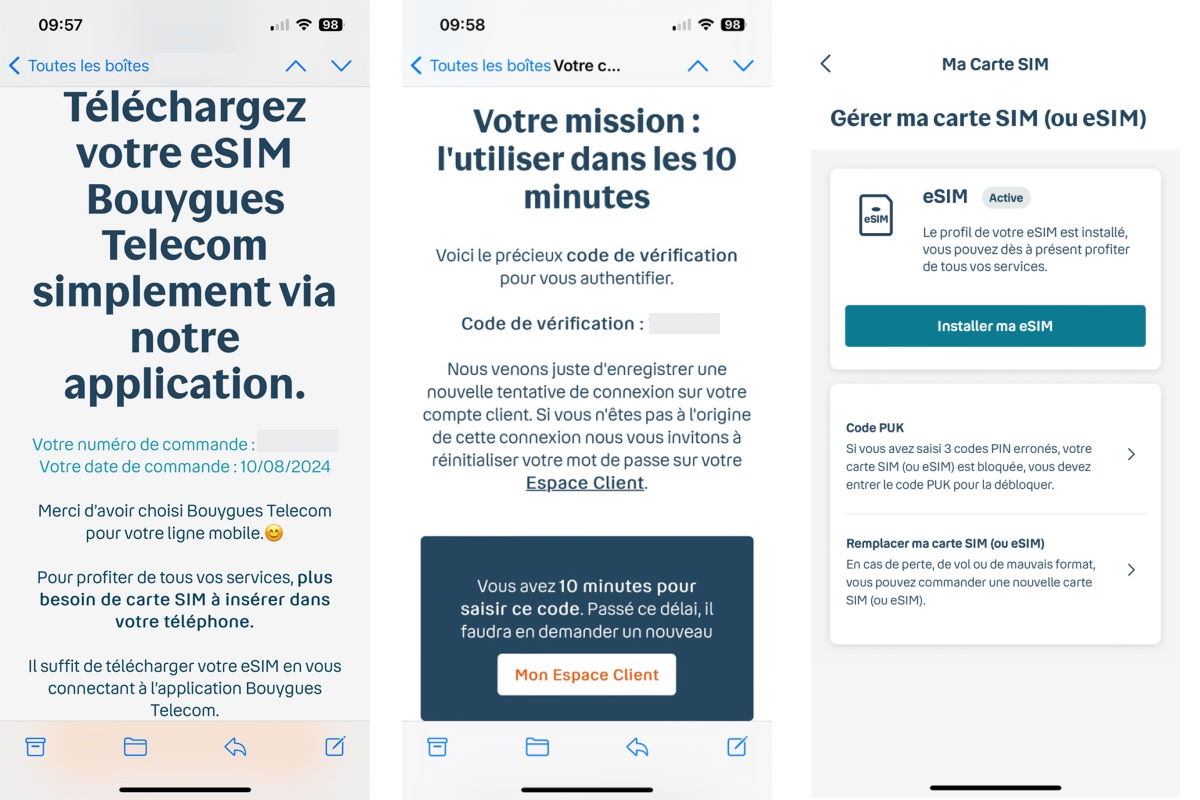 Autre point positif de ce forfait : la eSIM était au même prix que la carte SIM, seulement 1€. Bref, une affaire qui roule ! J'ai donc effectué toutes les étapes de souscription, jusqu'à sélectionner la carte eSIM au lieu d'une carte SIM classique. Quelques secondes après la prise en compte de ma souscription, ma boîte mail affichait une notification : ma carte eSIM était prête à être mise en service.