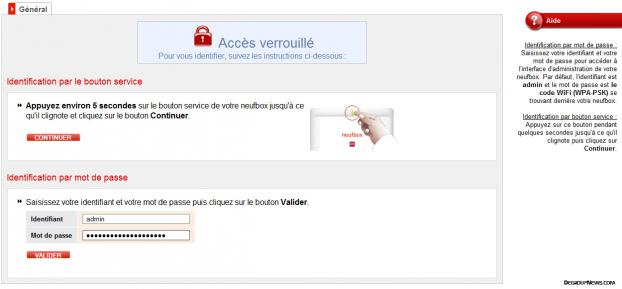 Pour découvrir les différentes parties de l'interface, il faudra s'identifier. La neufbox propose deux méthodes d'identification : soit en entrant un login et un mot de passe, soit en utilisant le bouton situé sur le modem.