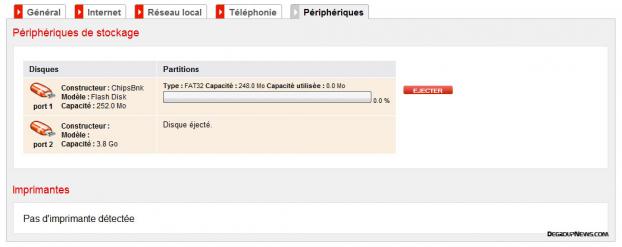 La neufbox dispose également de deux ports USB pour accueillir une imprimante ou des périphériques de stockage (disque dur, clé USB). La page Périphériques du menu Etat permet de connaître l'état des éléments connectés.