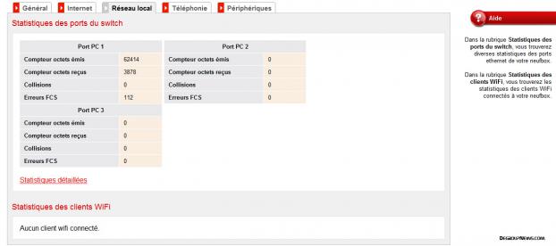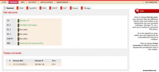 La page Etat permet d'avoir un aperçu global de l'activité de la box classée par ports ainsi que des informations sur les postes connectés (adresse MAC, adresse IP, port de connexion).