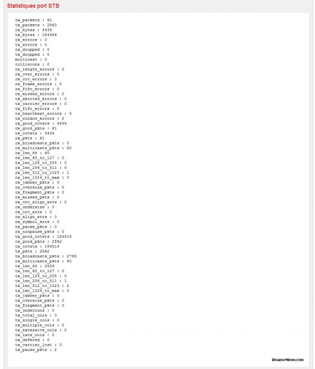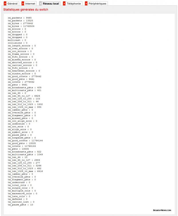 En cliquant sur Statistiques détaillées, nous découvrons une page remplie de chiffres consacrée à l'activité du switch (nombre de paquets échangés, erreurs rencontrées...) :