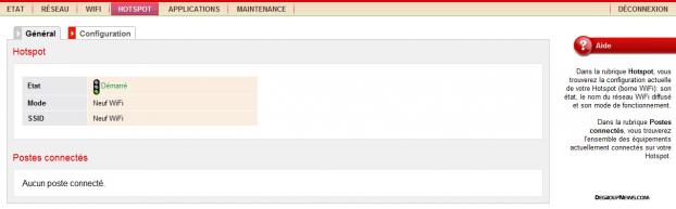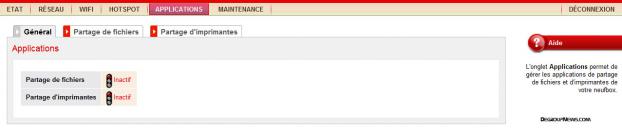 Cette fonctionnalité, propre à la neufbox, est particulièrement intéressante. Grâce aux nombreux Hotspots des abonnés, le réseau Neuf WiFi compte des points d'accès partout en France. Une carte référençant les bornes Neuf WiFi/FON est disponible à cette adresse : http://cartewifi.sfr.fr/La partie Applications va permettre de configurer les partages de périphériques de stockage ou d'impression.