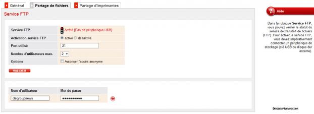 Après avoir inséré un ou plusieurs périphériques de stockage dans les ports USB de la neufbox, il faut activer le service FTP permettant de partager le contenu présent. La neufbox permet de mettre en place un système d'identification pour accéder au périphérique.