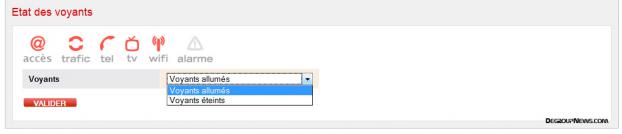 La dernière partie, consacrée aux voyants, permet de suivre l'activité lumineuse de la box et de contrôler leur allumage.