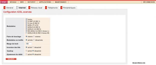 Nous nous retrouvons face à plusieurs choix en ce qui concerne la négociation de la modulation (G.DMT, ADSL,ADSL2/2+, Re-ADSL2...). Mais d'autres options de configuration sont présentes comme la Paire de bouclage qui indique quelle paire de fils est utilisée sur le câble RJ11 reliant la box à la prise téléphonique ou la Modulation en treillis qui limite les erreurs dues à l'influence du bruit sur la ligne.