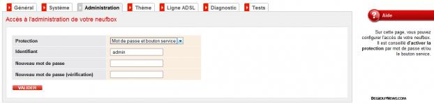 Le niveau suivant permet de configurer l'accès à l'interface d'administration de la neufbox en changeant la méthode de protection (bouton multiservice, identification par mot de passe). Il est également possible de modifier l'identifiant et le mot de passe du compte d'administrateur.
