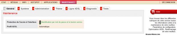 Toute une partie de l'interface d'administration est dédiée à la maintenance et l'optimisation de la neufbox. Le premier onglet ne donne accès qu'à deux informations générales à savoir le profil ADSL utilisé et la méthode d'identification pour accéder à l'interface de la box.