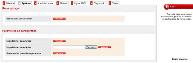 L'onglet Système permet de redémarrer le modem et de modifier les paramètres de configuration de la box (import, export, restauration de la configuration par défaut).