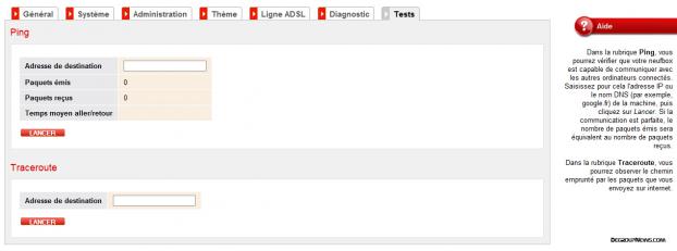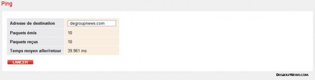 Le test de ping est tout ce qu'il y a de plus simple. Une fois une URL ou une adresse IP entrée dans le champ correspondant, on lance les tentatives de ping. La neufbox va ensuite afficher le nombre de paquets émis et reçus (qui doivent être identiques), ainsi que le temps de réponse moyen.