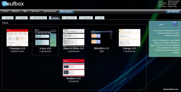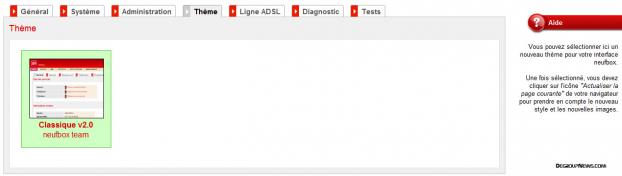La page Thème a pour objet de modifier l'apparence de l'interface d'administration. La box ne contient que l'habillage aux couleurs de SFR mais il est possible d'avoir d'autres thèmes sur le site http://www.neufbox4-themes.org