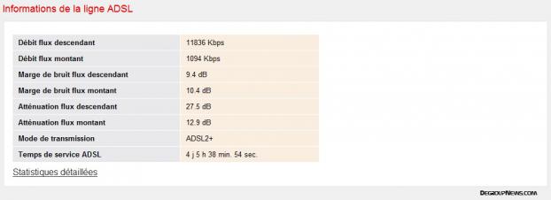 En cliquant sur Statistiques détaillées, nous arrivons sur une page plus complexe délivrant des informations plutôt pointues à propose de la ligne ADSL. En plus de données telles que l'atténuation, la marge au bruit, nous trouvons les taux d'erreurs CRC, les pertes de trame (LOF) ou de synchronisation (LOS).