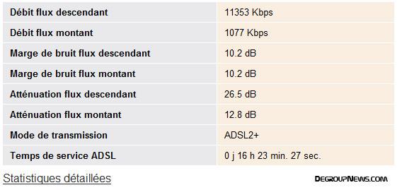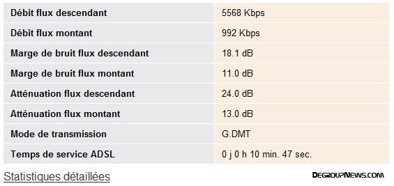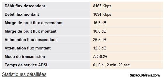 Le résultat détaillé de DegroupTest nous donne un débit indicatif sur le réseau SFR de 13333 kb/s en voie descendante et de 667 kb/s en débit montant, des valeurs approchant celles relevées lors des tests Bbox sur la même ligne.