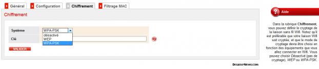 Pour compléter la configuration de sa connexion sans fil, il faudra se rendre sur l'onglet suivant pour paramétrer la sécurisation de son accès. L'onglet Chiffrement donne la possibilité de choisir la méthode de cryptage du signal Wi-Fi. On peut désactiver le chiffrement, choisir la méthode WEP ou un cryptage WPA-PSK. Il suffit ensuite d'entrer la clé de cryptage dans la case suivante et de valider.