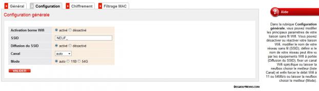 Regardons donc de plus près comment configurer son accès sans fil. L'onglet Configuration permet de modifier les principaux paramètres de la connexion Wi-Fi de la neufbox.