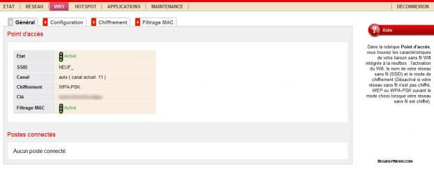 Cette page nous dévoile donc des renseignements comme l'état de l'accès Wi-Fi, le SSID du réseau sans fil ou encore la clé et le mode de chiffrement. On y trouve également une liste des postes connectés à la box en Wi-Fi.