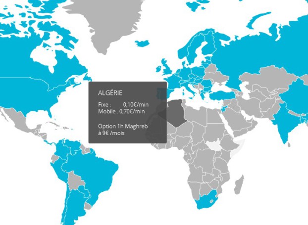 Si les tarifs des communications vers l'Algérie vous semblent trop élevés, notez que l’opérateur propose à ses abonnés de profiter d’une heure d’appel vers les fixes et mobiles du Maghreb (Algérie, Maroc, Tunisie) pour 9€/mois. On regrette que cette option soit si limitée en termes d'heure de communication.