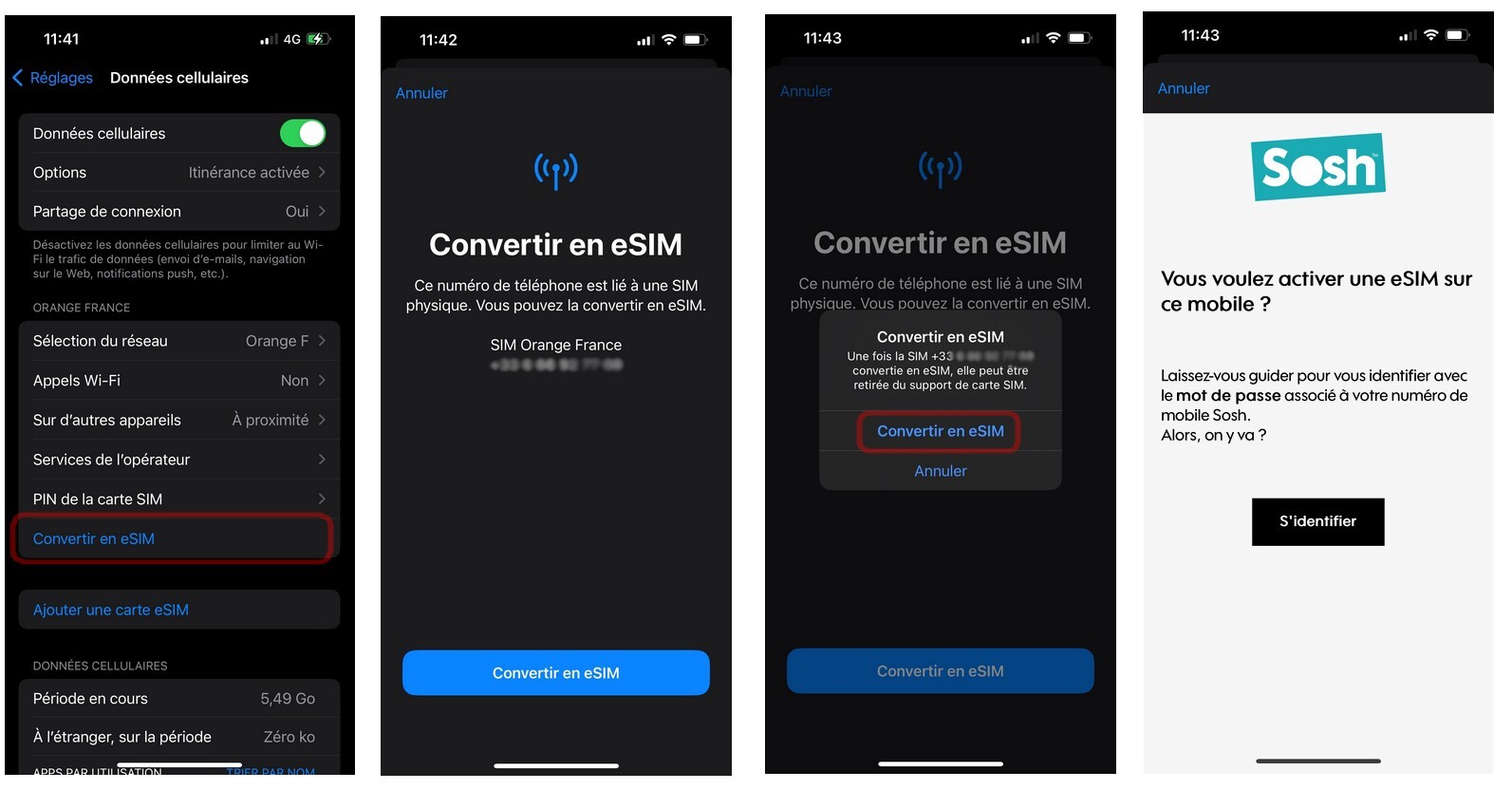 Pour ce faire, il suffit de se rendre dans les Réglages d'iOS, ouvrir la rubrique Données cellulaires et cliquer sur le bouton "Convertir en eSIM". Une fois ces étapes suivies, vous serez automatiquement redirigé vers le portail Orange ou Sosh et vous aurez juste à vous identifier. Attention, des frais de transfert, qui s'élèvent à 10€, vous seront demandés pour prendre en compte la migration.