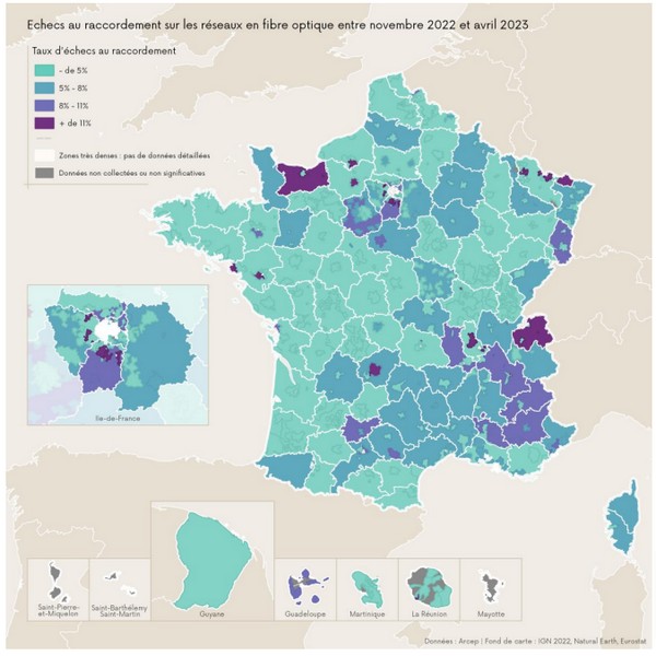 Dans le Calvados, la Haute-Savoie, plusieurs départements du quart sud-est ou d'Alsace-Lorraine ainsi que quelques réseaux en Essonne, ce taux est supérieur à 11 %. Plus précisément, la situation est encore un peu plus critique dans certains réseaux d'initiative public, avec des taux d'échecs au raccordement bien supérieurs :