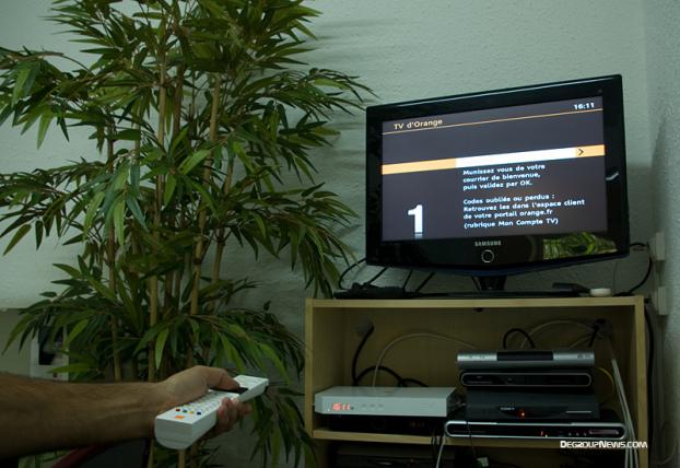 Nous voici donc parés pour notre premier contact avec le décodeur. Nous sommes accueillis par une page nous précisant que nous devons nous munir de notre courrier de bienvenue afin d’entrer notre identifiant à l’aide de la télécommande.