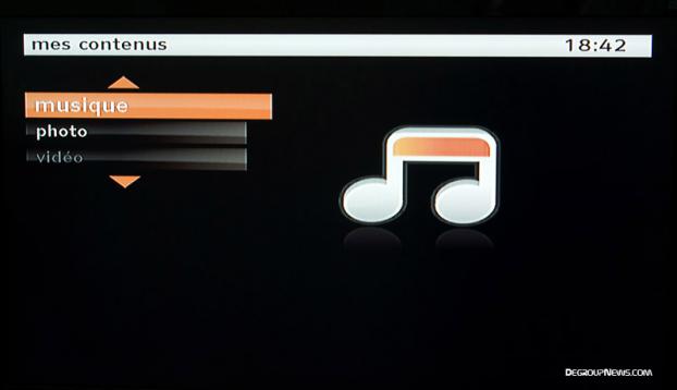 Ce décodeur n’est donc pas une bête de course en ce qui concerne l’exécution de tâches simples comme l’accès à l’espace VoD ou la configuration du signal TV. L’interface se veut minimaliste et épurée mais ne gagne pas en rapidité. La partie multimédia, atout important des décodeurs, a-t-elle fait l’objet d’un effort particulier pour lui donner meilleure allure ?L’accès aux fichiers multimédia se fait par le biais de la touche verte de la télécommande ou via le menu principal. La page d’accueil intitulée « Mes contenus » est d’une sobriété désarmante comme nous pouvons le voir sur cette image :