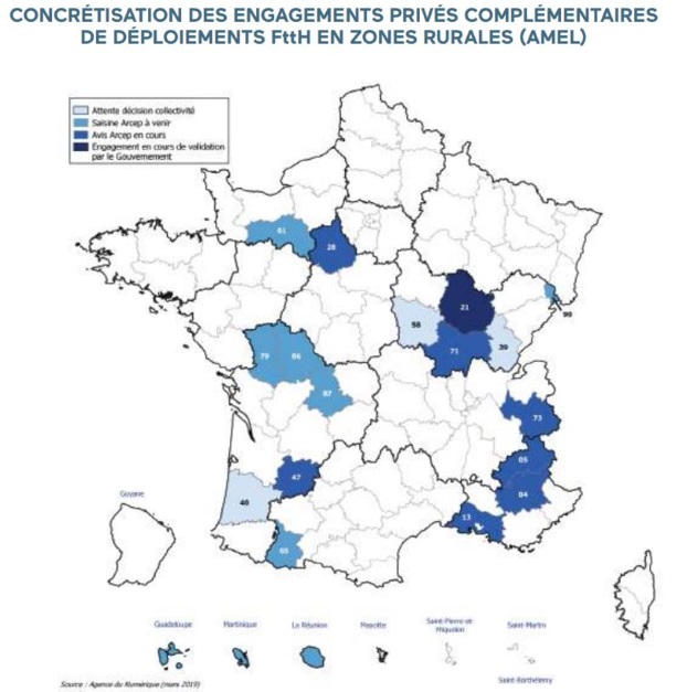 L'exécutif espérait se décharger grâce à ces appels à manifestations d'engagement locaux (AMEL) d'un financement partiel de 3 millions de lignes, il en aura finalement obtenu "un peu plus de 1,5 million", dans une vingtaine de départements, recensés dans une carte par l'Agence du Numérique (ci-dessous). L'Arcep s'est d'ailleurs synchronisée sur le tempo gouvernemental pour officialiser son premier avis positif sur un projet de déploiement en AMEL, proposé par Altitude Infrastructure au département de la Côte-d'Or.